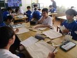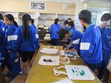1年生の美術の時間では、トートバックにデザインを描いています。今日の時間の終盤には、クラスメイトの作品を見て、自分に生かせそうなところに気付いたり、よいところを発表したりしました。出来上がりが楽しみです。