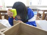 普段使うことのない、ボンドや金槌、キリ、紙やすりなどを使って、板を組み立て本棚をつくります。